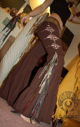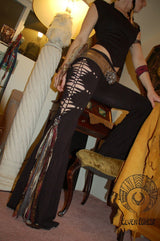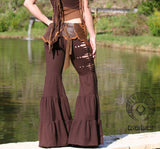 Braided cut out super flare pants with triple tiered ruffles and trinity braiding and cut out dots on the thighs make these sexy and unique. The flared bottoms are really fun to dance in. These are ultra hot, never get old, and are incredibly empowering to wear.
