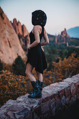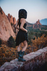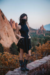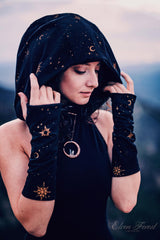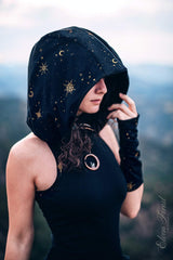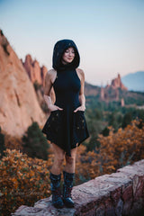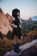 Cute little fit and flare dress featuring our hand printed celestial fabric on the structured, lined hood and lined pockets in the skirt. It also has an attached dust mask that can be worn up or down depending on your mood and environment. It has narrow cut shoulders to accentuate feminine curves, and the skirt flares out at the hips naturally for an hourglass flare. Perfect for festivals, dusty trips, Burning Man, or just for bringing some magic into your every day life.