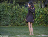 Long sleeved winter dress, with boat neck collar and generous mythical hood :) It has long sleeves and mini skirt with raw rolled hems, wide boat neck collar to show off your collarbone and extra large hood. The back has several tassel strings hanging down from the base. It also looks great over a long floor length skirt or pants. :)