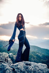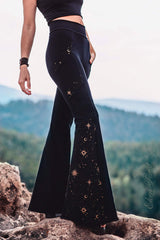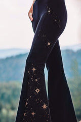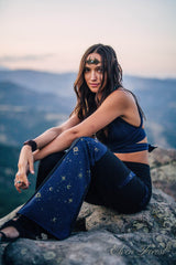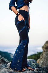 High waisted Bellbottoms with 4 pockets ~ all pockets are big and functional and super cozy. Featuring our hand printed celestial fabric is on all 4 pocket cuffs, as well as the side flare.