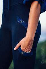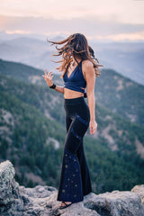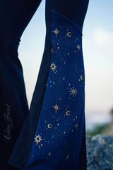 The base of the pant is black, our thickest and heartiest fabric, with our celestial print fabric on the accents. Accent color is your choice: either Black or Midnight, and then printed with a gold sparkle eco friendly screen print.