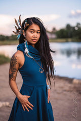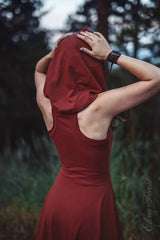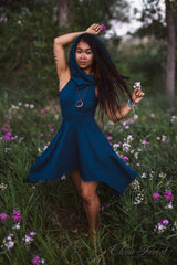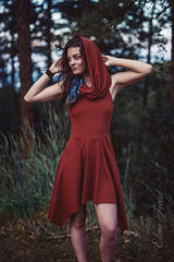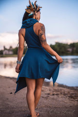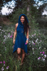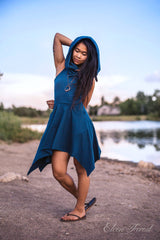 This whimsical number is designed to be flattering to every figure. Featuring a cowl hood, fit and flare pixie skirt with uneven hem, and angled shoulders to accentuate feminine curves. The skirt hem is raw and rolls to add structure to the pixie shape and the shoulders are accented with our signature double roll cuffs. (Shown in teal and terra cotta)