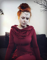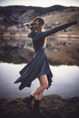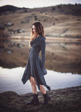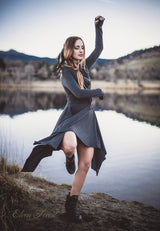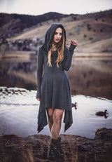 This whimsical number is designed to be flattering to every figure. Featuring a cowl hood, fit and flare pixie skirt with uneven hem, and long sleeves with thumbholes.