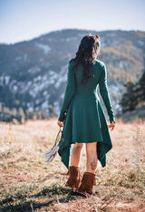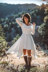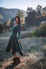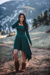 This whimsical number is designed to be flattering to every figure. Featuring a scoop neck collar, fit and flare pixie skirt with uneven hem, and long sleeves with thumbholes.