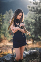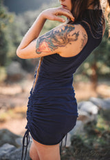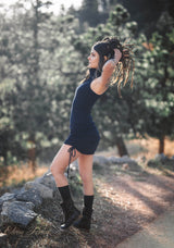 This little dress is really easy to throw on and go anywhere. It can be dressed up or dressed down, making it perfect for everyday wear. It features a keyhole cut out and adjustable length with the scrunchie sides, double roll cuffs on the arm holes, and raw rolled hem on the skirt bottom.