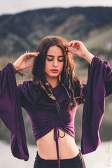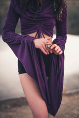 Little crop top, gently off shoulder, with giant cowl hood and scrunchie in front or back (its reversible if you want the scrunchie in back). Perfect for festival season. Perfect for dressing up in so many kinds of costumes. Perfect for being a goddess. Also looks wonderful layered over a dress too when you want to add sleeves and a hood.