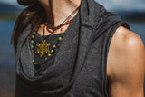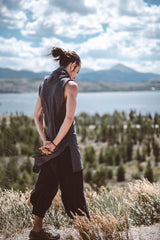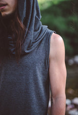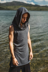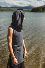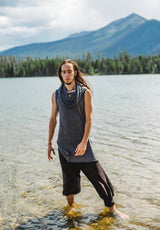 Sleeveless Tank with Persian hem and Generous Hood, which can be worn up as a hoodie or down as a cowl neck. Sides are open for greater movement ability. Super super comfortable, you'll want to wear it all the time. This top is really great for moving, dancing, martial arts, festivals and anything really. The fabric is soft and stretchy and looks great at the same time.