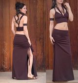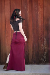 Fun to wear, flattering maxi skirt with sexy openings in the sides. Ties make the length of the skirt extremely adjustable. Openings on both sides with drawstring scrunch effect. Extremely flattering. You can play with the rise, wearing this one low on the hips or up at the navel~ its adjustable using the drawstrings at the sides.