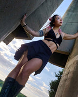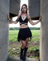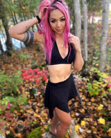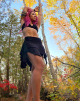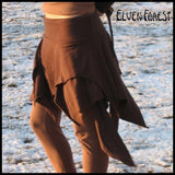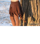 This is a beautiful pixie skirt made from jersey with a nice stretch. It has uneven raw hems everywhere, giving the versatility of both a long and a short skirt.