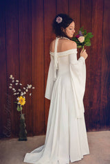 Long fit and flare gown with fluted fairytale sleeves, off shoulder neckline, and braid detailing on the bust and straps. This dress is made to be very flattering with fitted bust and flared skirt. It can be worn off shoulder or pulled up a little at the shoulders.