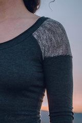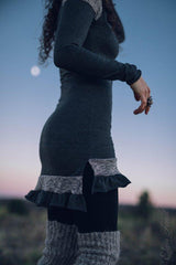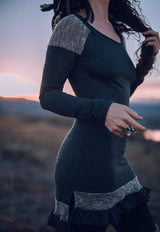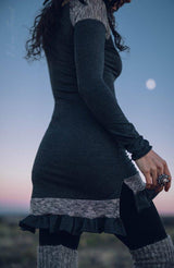 Charcoal sweater embellishments on this timeless raglan dress. Long sleeves have raw rolled hem and bottom of skirt has a cute little ruffle with opening at the hips. Collar is our signature double roll cuff with raw rolled edges.