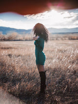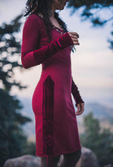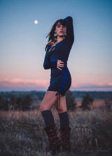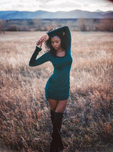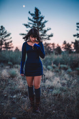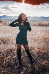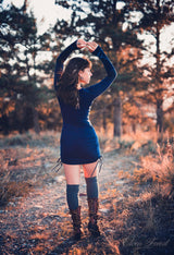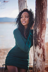 Fitted, scrunch up sides to flatter the hips and create more of an hourglass figure, and velvet accents on the collar, cuffs and scrunchie trim on hips. Length is adjustable because the sides scrunch up with drawstrings - you can wear it as a mini dress with it scrunched up or let it go and wear as a longer dress that goes closer to the knees, or anywhere in between.