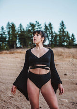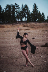 Kimono sleeve wrap top. It can be worn in a few different ways, as shown in the photos. One of the best things about it is that you can wear it as a crop top and as extra sleeves to spice up any dress or outfit.