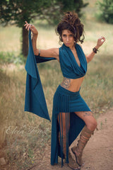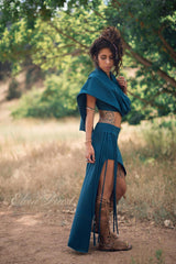 Flattering maxi skirt with asymmetrical drape in front, and 6 tassel fringe strings hanging on one side. This one is really fun to wear and will definitely make you feel powerful when you wear it.