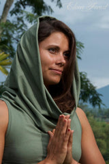 Hoodie crop top with raw rolled hems and racerback finish. Hood can be worn as a cowl or up around your head. Seam up the back gives it a fitted shape.