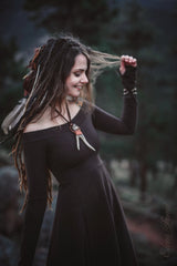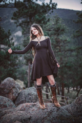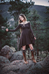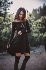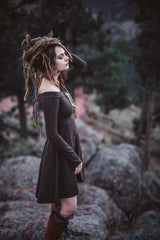 Off shoulder fit and flare dress with long sleeves, thumbholes, and pointed tail feather type draped back.