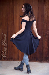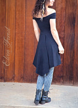 Off shoulder fit and flare dress with little sleeves, and pointed tail feather type draped back.