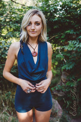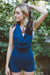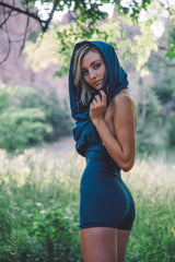 Retro festival style onesie with convertible modern flare. Fitted body with big cowl hood and open back. Shorts have a small cuff, and an extra panel sewn into the crotch as a pantyliner and to make the onesie camel-toe resistant. Fabric is very soft, stretchy, and easy to lounge around as well as dance in ~ always comfortable and breathable.