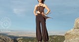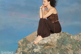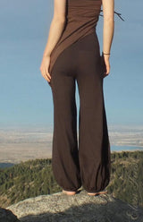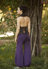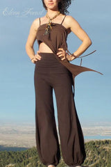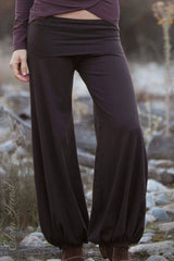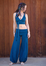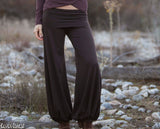These are so incredibly comfortable, I never want to take them off. Simple fitted top and gathered bottom harem pant with tall waistband. The waistband can be worn up or folded over for a low rise pant. The gather on the bottoms end with a one inch cuff, and are slightly longer in the back than in the front, so they will rest on the tops of your feet nicely.