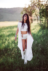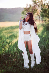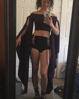 Wing Sleeved Goddess top ~ this one is great for festivals, especially burning man. Its also good for goddess events and shoots. Its gently off shoulder, though you can pull the straps up like a tank if you wish too. Sleeves are generous, and flowing while allowing you full freedom with your arms, as the opening goes all the way up to the shoulder cuff. It has a slimming effect on the hips because of the way it drapes. This also pairs well over a tank dress or with pants.